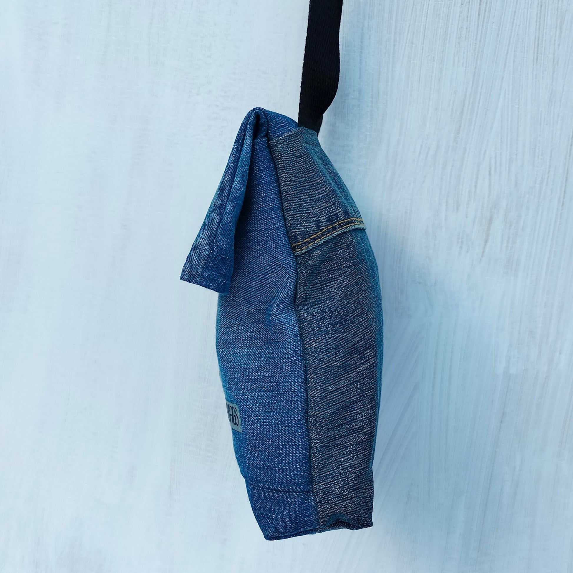 - DISEÑO SOSTENIBLE: Bolso bandolera confeccionado a mano con tela vaquera reciclada, utilizando solo algodón y herrajes metálicos en su fabricación