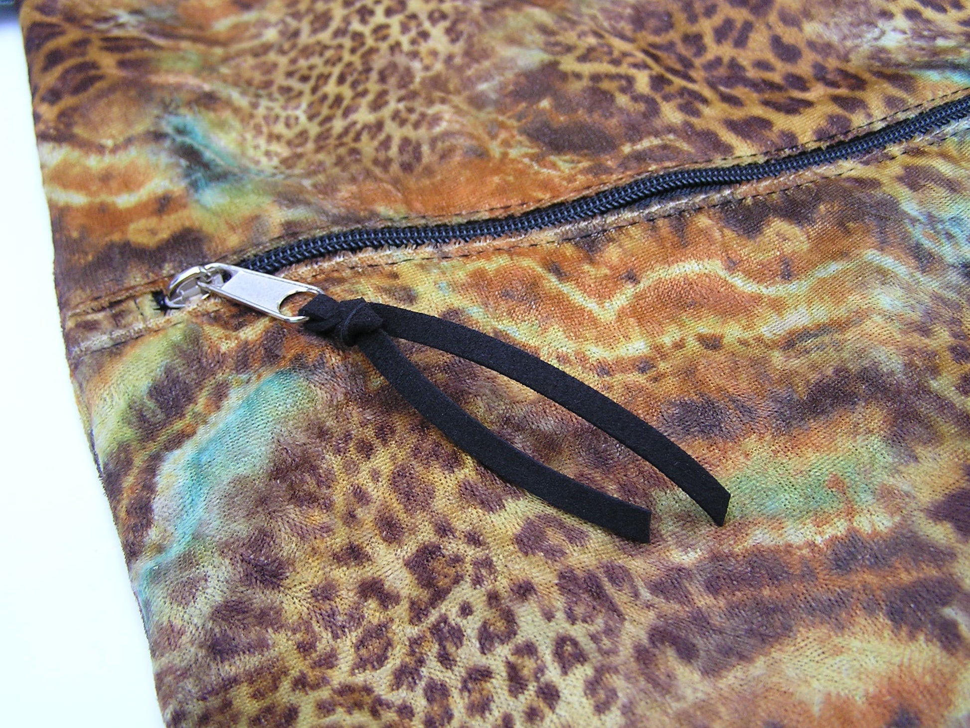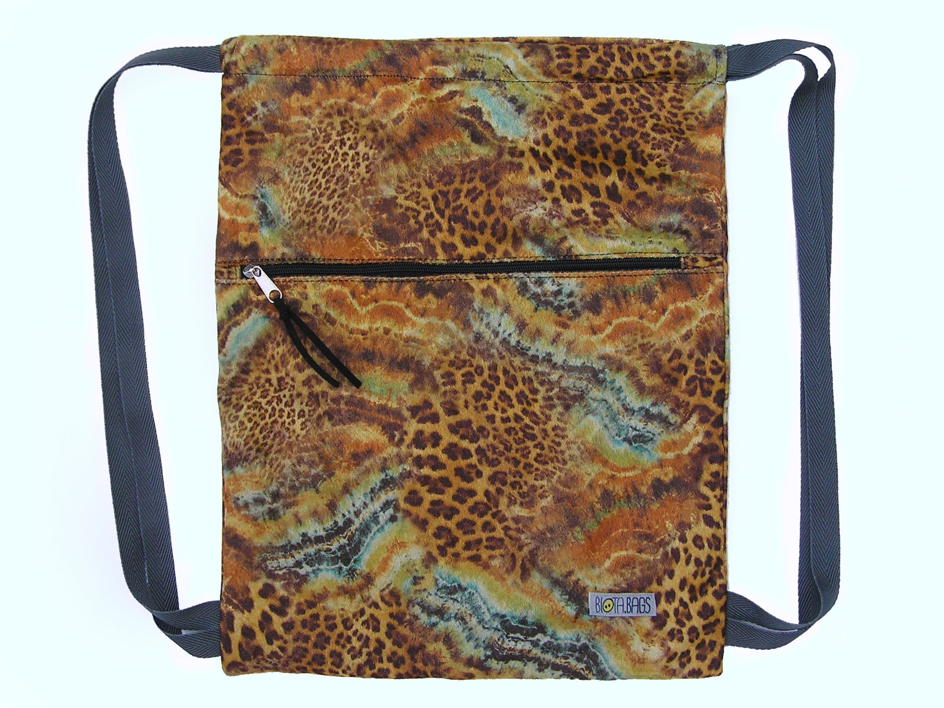 Mochila saco de tela estampado print animal leopardo, de pelo corto.