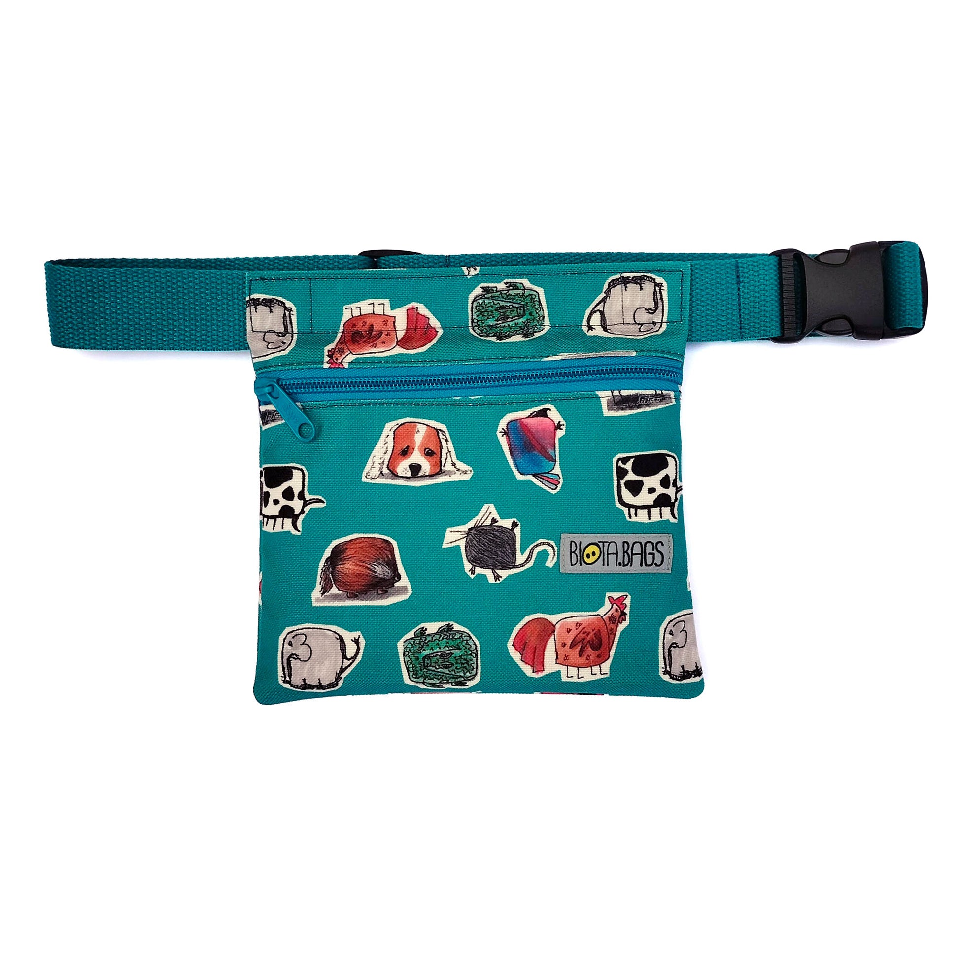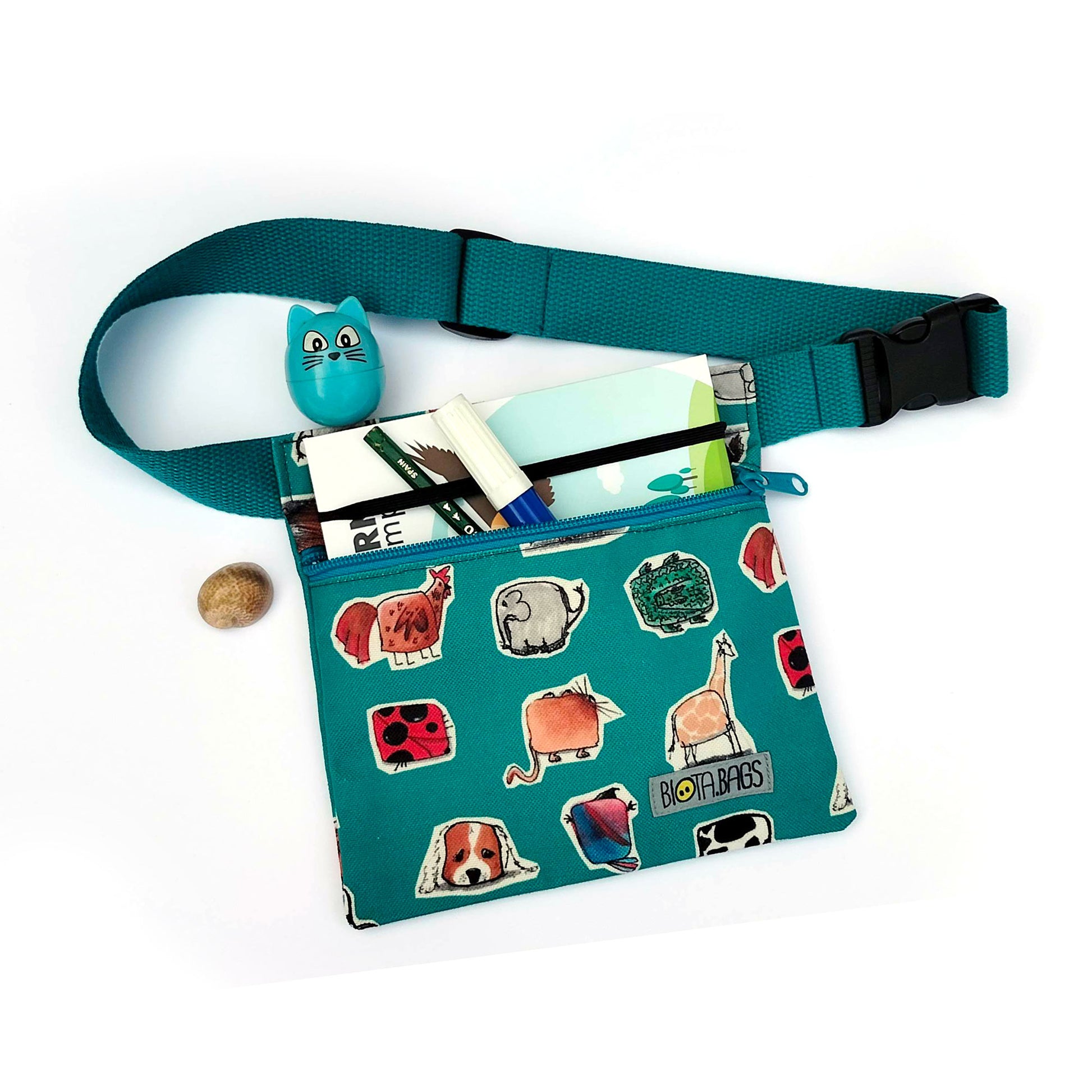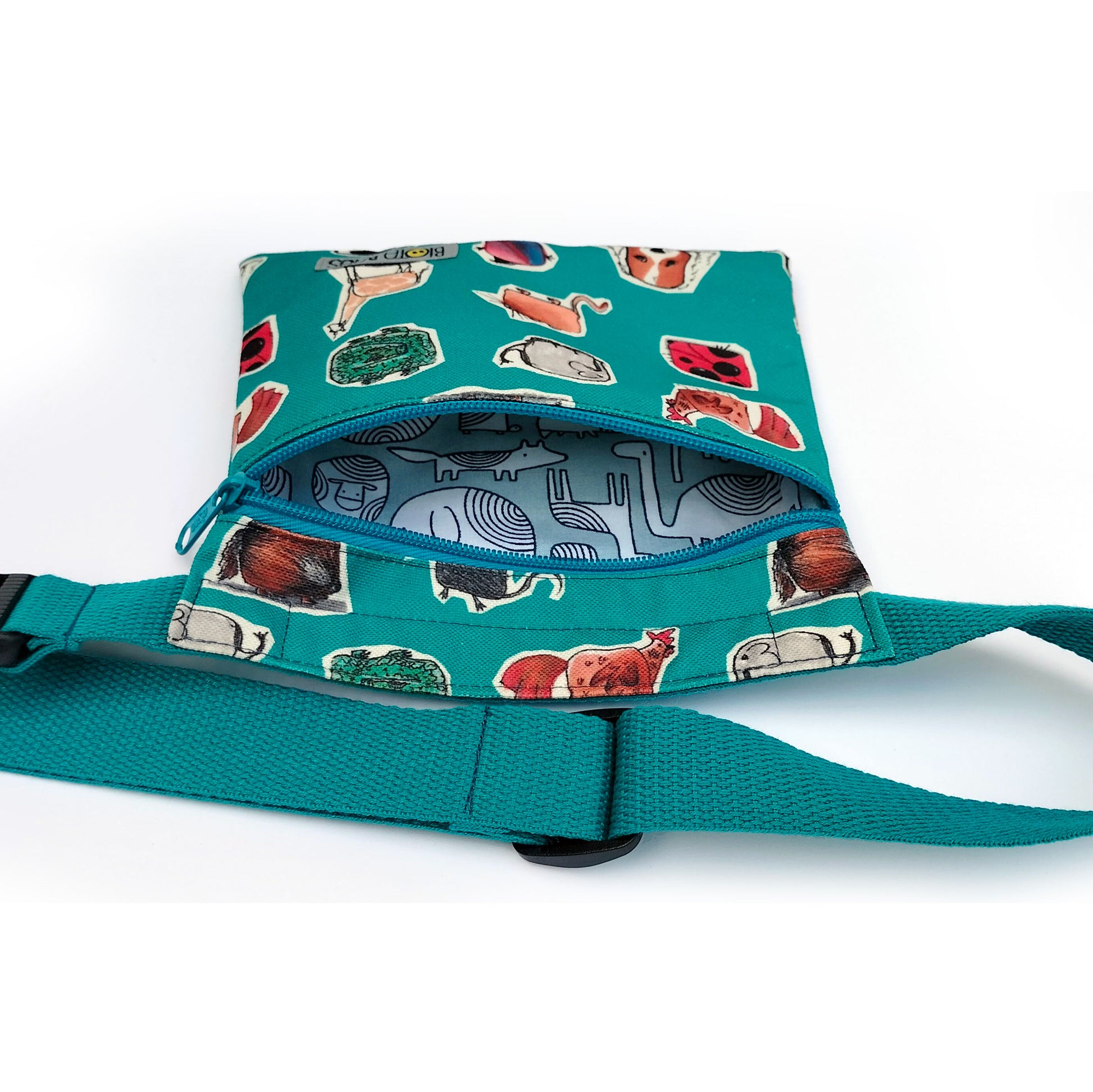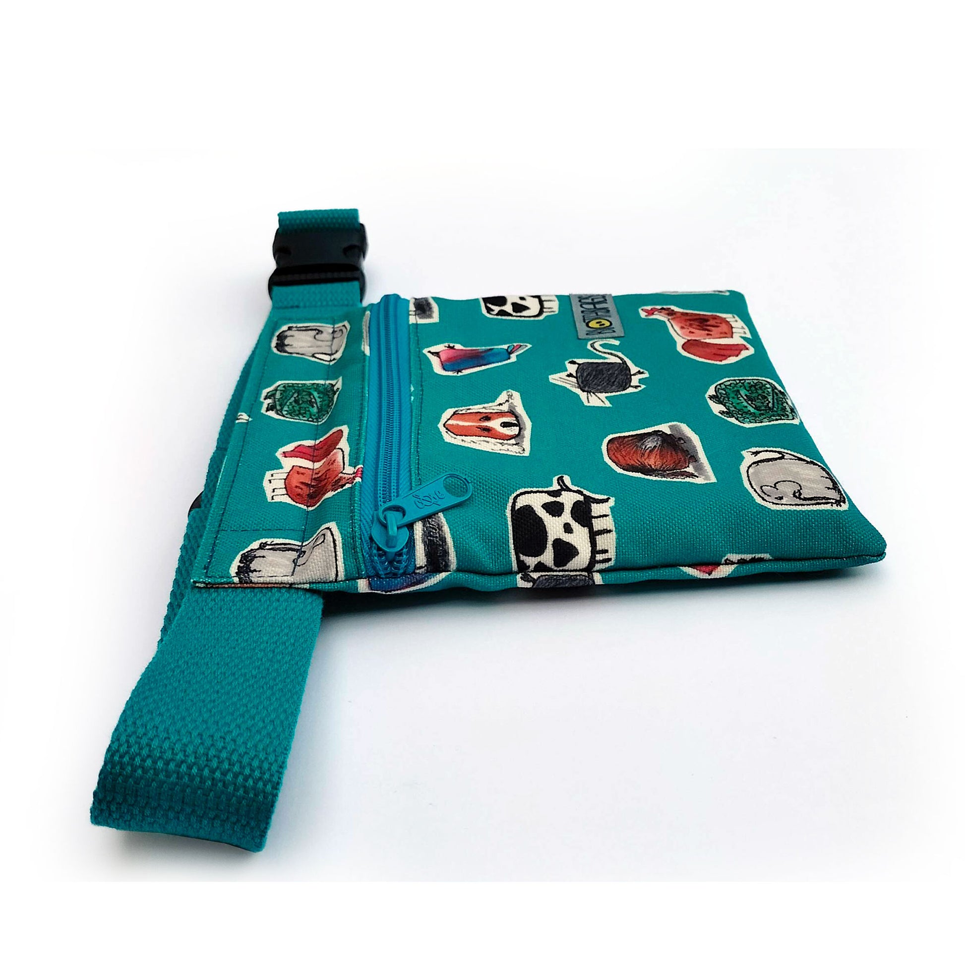 Riñonera de diseño exclusivo con dibujos de @deltoro, estampado digital en tela reciclada de PET, simpáticos y coloridos animales sobre fondo turquesa. El cinturón y cremallera también en turquesa.