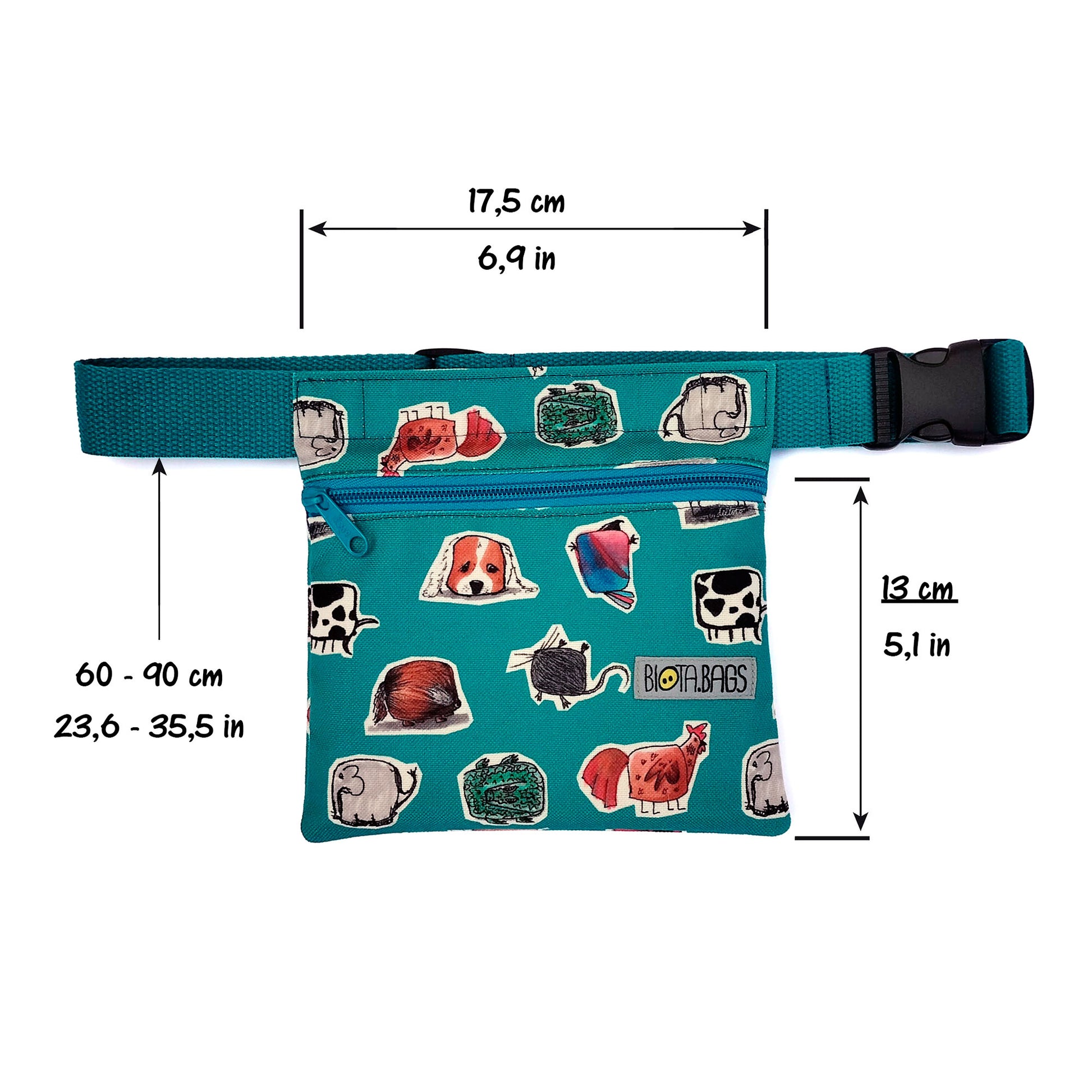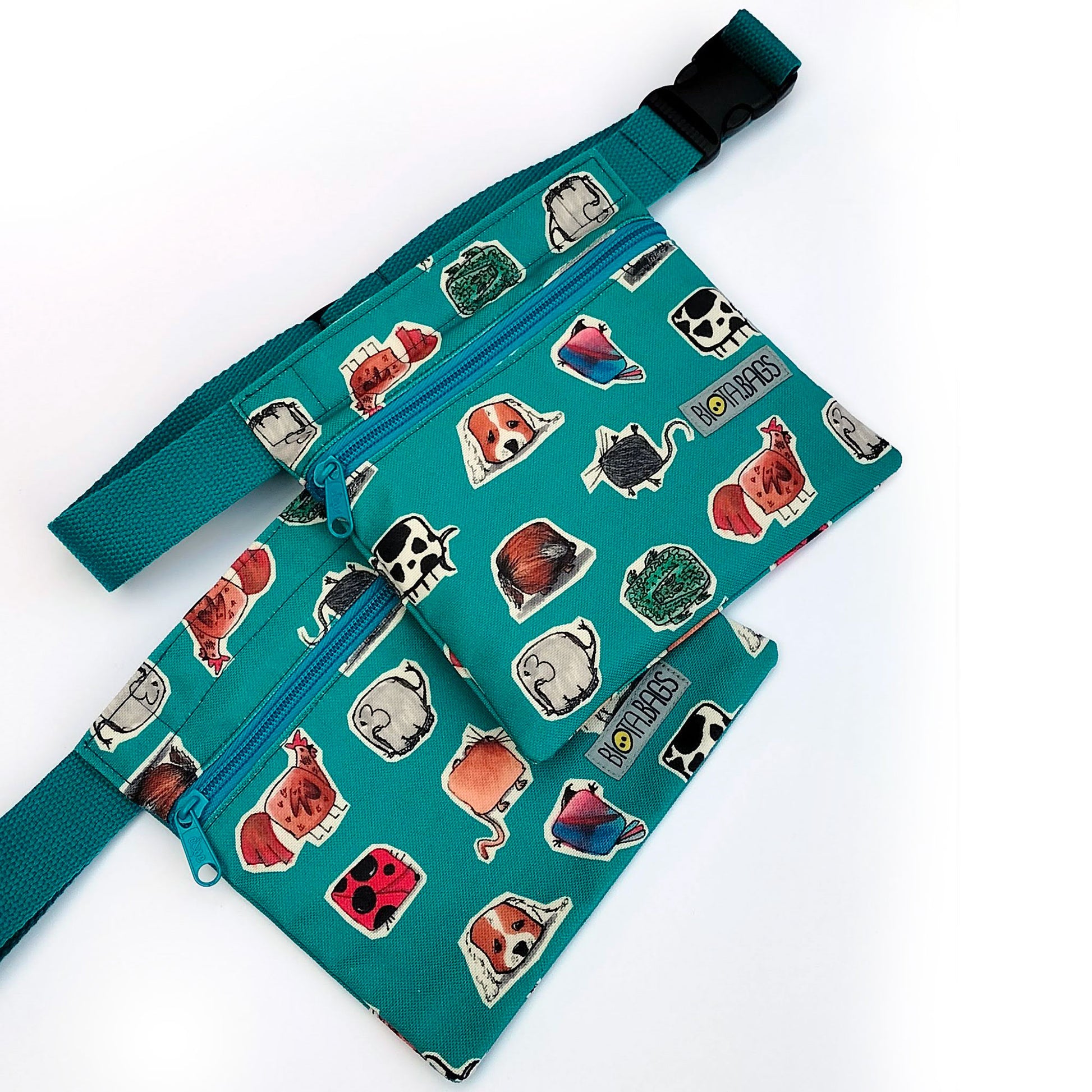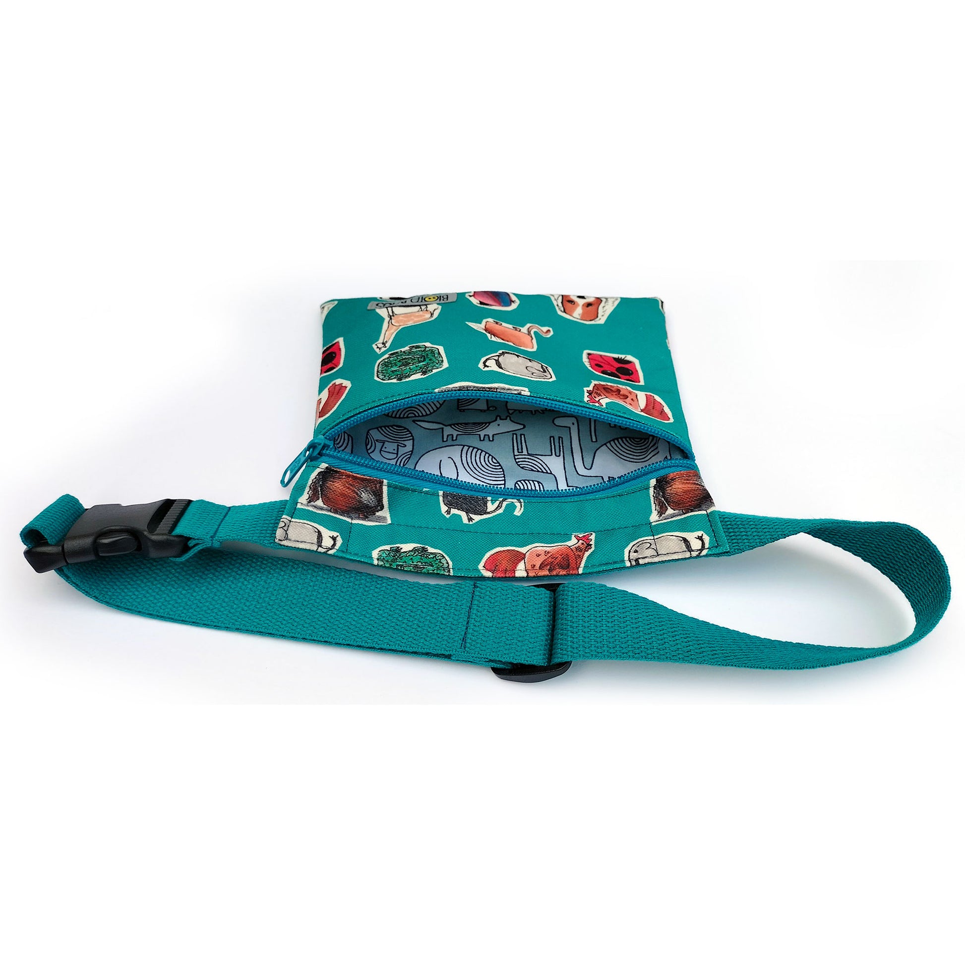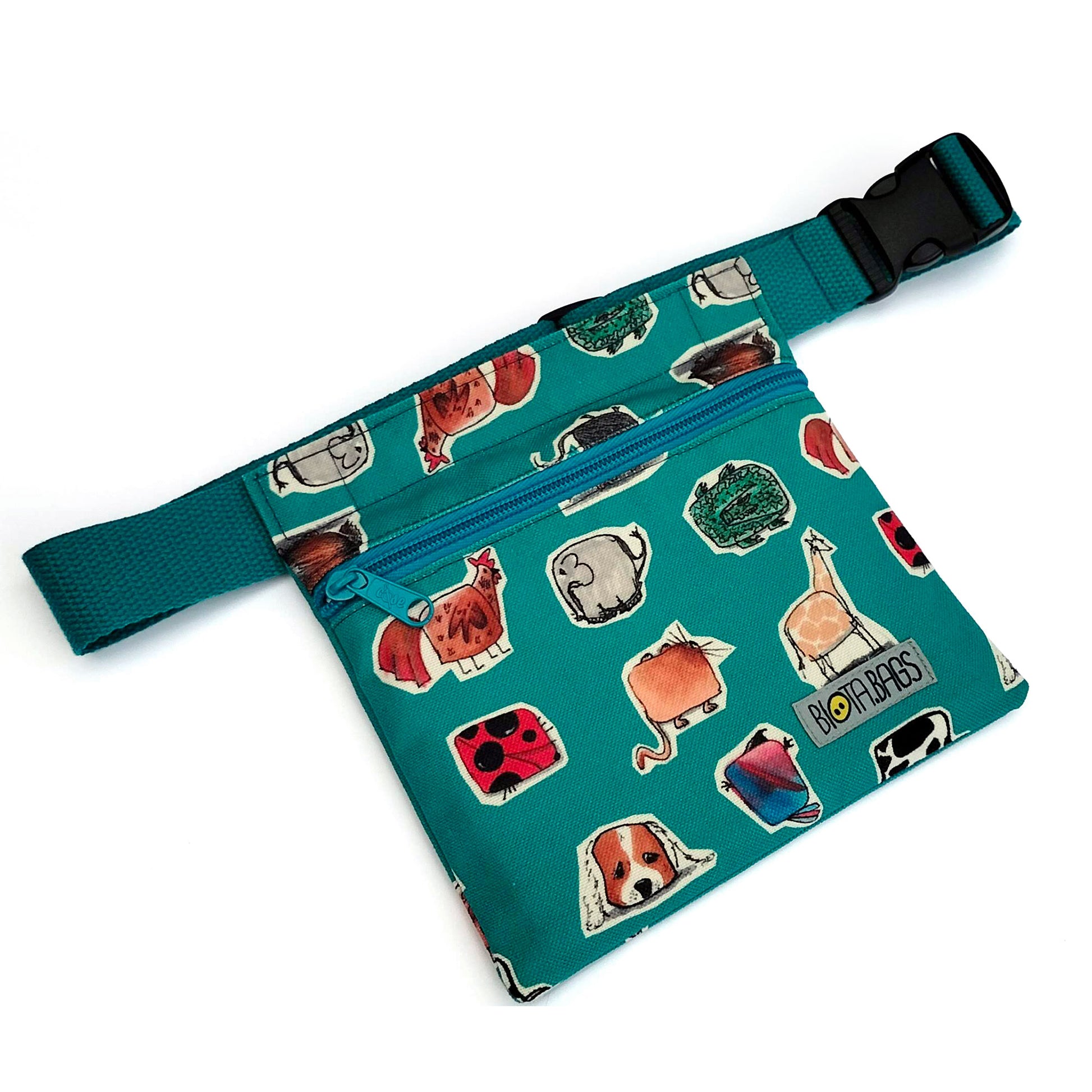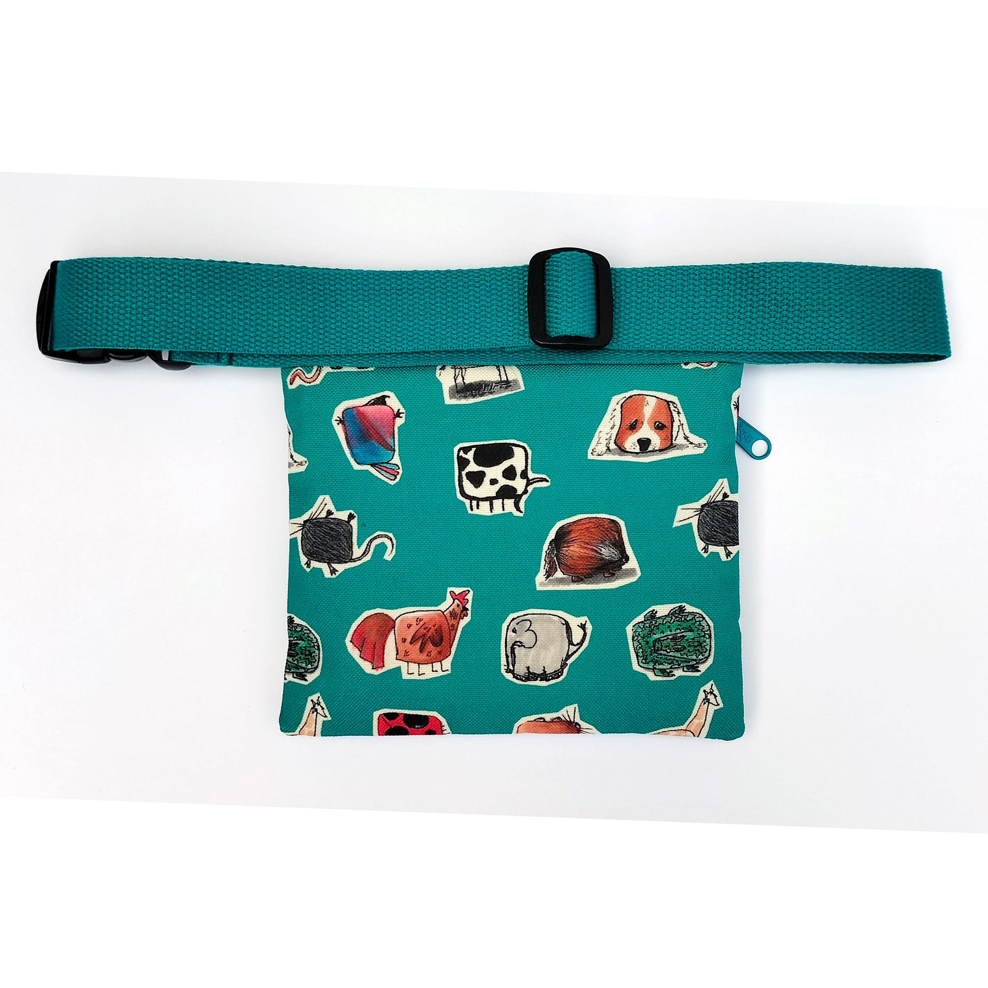 Riñonera de diseño exclusivo con dibujos de @deltoro, estampado digital en tela reciclada de PET, simpáticos y coloridos animales sobre fondo turquesa. El cinturón y cremallera también en turquesa.