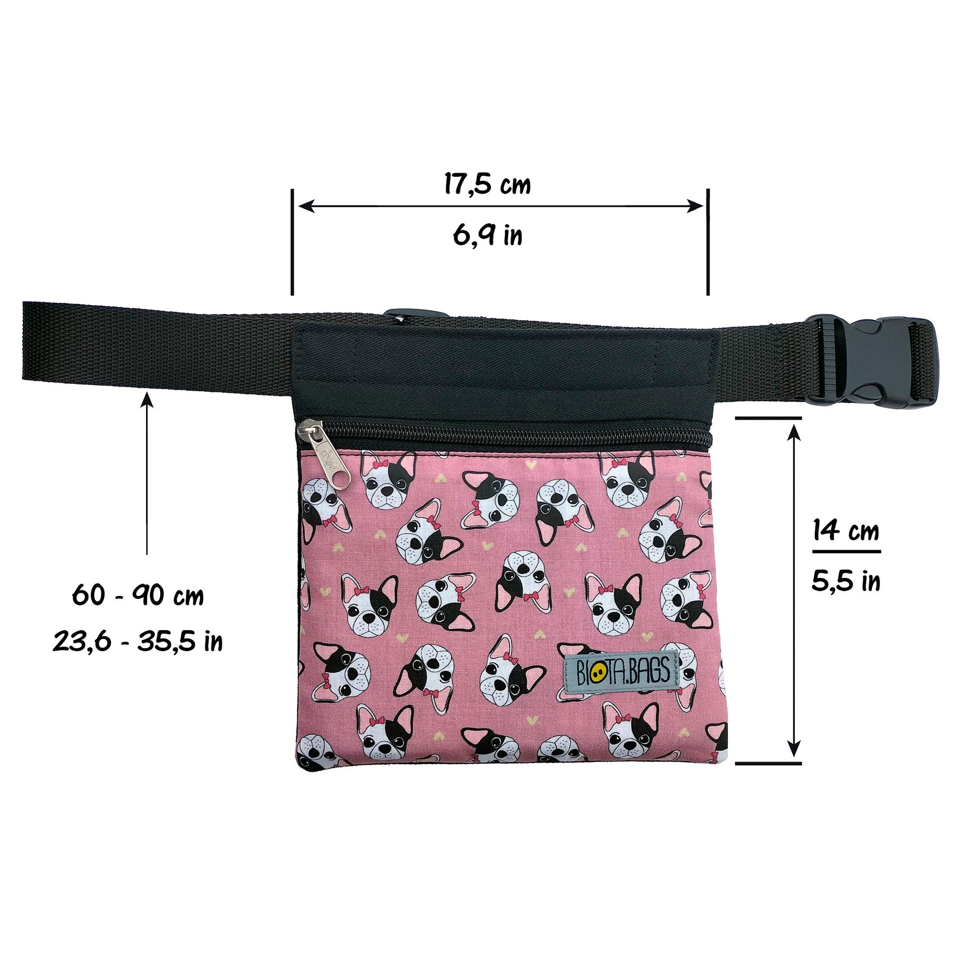 Confeccionada con tela de algodón estampada de Perritos sobre fondo Rosa y sarga color Negro.